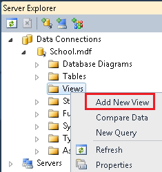 在 “服务器资源管理器”中,展开“ School.mdf”,右键单击“ 视图 ”文件夹,然后选择“ 添加新视图”。
