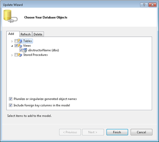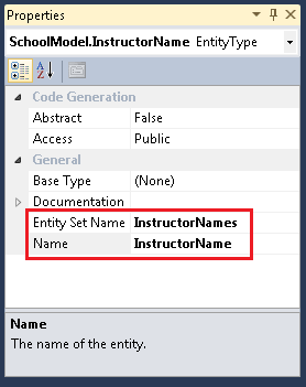 在“ SchoolModel (不 SchoolModel.Store) ”下,右键单击“ vInstructorName ”,然后选择“ 属性”。 在 “属性” 窗口中,将 “Name ”属性更改为“InstructorName”,将 “实体集名称 ”属性更改为“InstructorNames”。