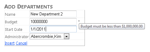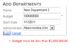 如果 输入的预算金额 无效,然后单击“ 更新”,则会看到在 Departments.aspx 页中看到的相同星号和错误消息。