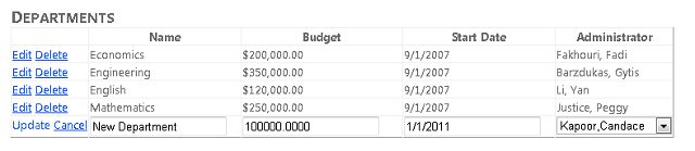 在 Departments.aspx 页中单击“更新”时,ObjectDataSource控件会创建两个Department要传递给 方法的UpdateDepartment实体。 一个包含存储在视图状态中的原始值,另一个包含控件中 GridView 输入的新值。 方法中的 UpdateDepartment 代码将 Department 具有原始值的实体传递给 Attach 方法,以便在实体与数据库中的内容之间建立跟踪。 然后,代码将 Department 具有新值的实体传递给 ApplyCurrentValues 方法。 对象上下文比较旧值和新值。 如果新值与旧值不同,则对象上下文将更改属性值。 然后, 方法 SaveChanges 仅更新数据库中已更改的列。 (但是,如果此实体的更新函数映射到存储过程,则无论更改了哪些列,都将更新整行。)
