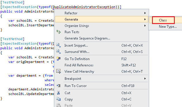 尚未创建异常类,因此此代码不会编译。 若要使其进行编译,请右键单击并选择“DuplicateAdministratorException生成”,然后选择“类”。