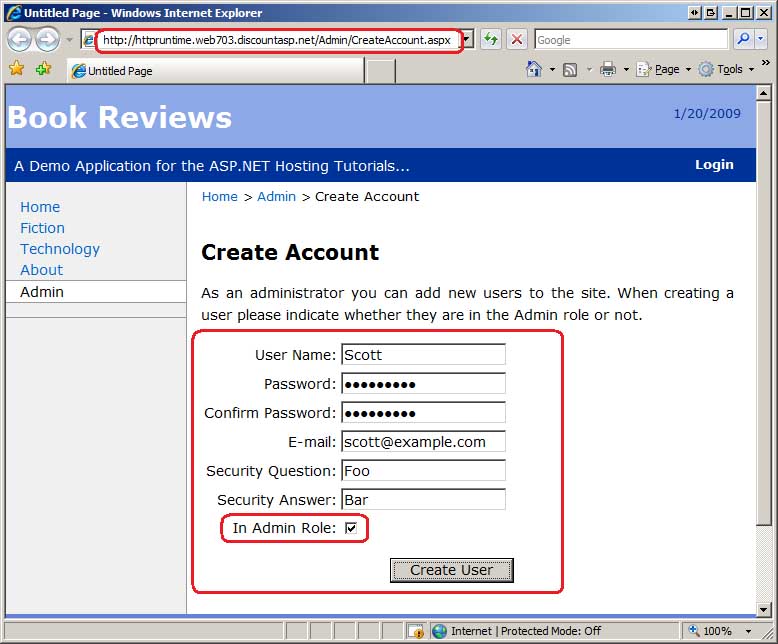 Book Reviews Web 应用程序使用成员资格和角色 API 来支持用户帐户,并将这些用户分组到角色 (即管理员角色) 。
