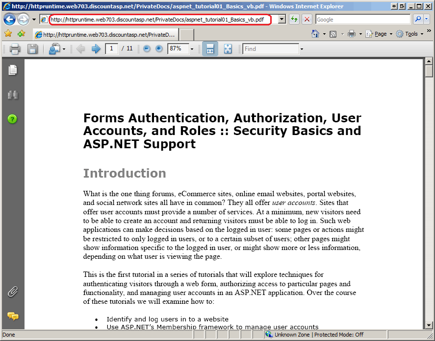 使用 ASP.NET 开发服务器访问站点,并在浏览器的地址栏中输入其中一个 PDF 文件的直接 URL。 如果下载了与本教程关联的网站,URL 应如下所示: http://localhost:portNumber/PrivateDocs/aspnet_tutorial01_Basics_vb.pdf