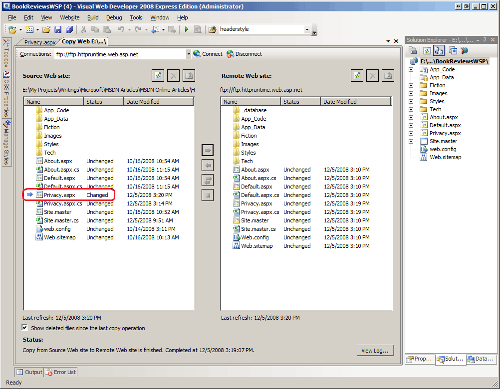 除了列出新文件,“复制网站”工具还突出显示了本地站点和远程站点之间任何不同的文件。 若要了解此操作的操作,请返回到页面, Privacy.aspx 并在隐私策略中添加更多字词。 保存页面,然后返回到“复制网站”工具。 如图 5 所示, Privacy.aspx 左窗格中的页面状态为“已更改”,表示它与远程站点不同步。
