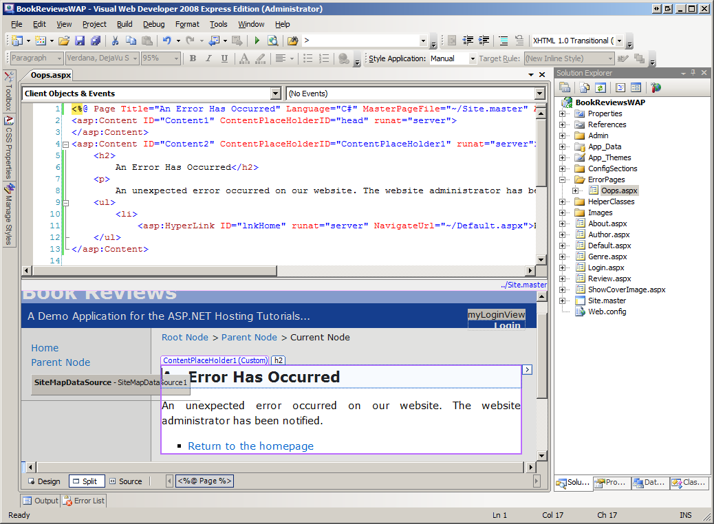 每个 Web 应用程序都应有一个自定义错误页。 它为运行时错误 YSOD 提供了更专业的替代方法,创建起来非常简单,将应用程序配置为使用自定义错误页只需几分钟时间。 第一步是创建自定义错误页。 我已向书评应用程序添加了一个名为 ErrorPages 的新文件夹,并向其添加了名为 Oops.aspx的新 ASP.NET 页。 让页面使用与网站上的其余页面相同的母版页,以便它自动继承相同的外观。
