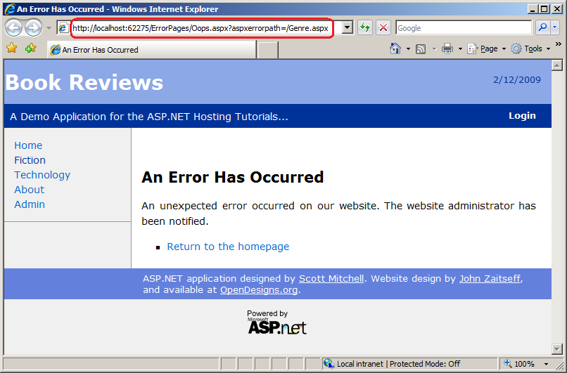 花点时间检查 图 3 中浏览器的地址栏。 请注意,“地址”栏显示) (/ErrorPages/Oops.aspx 自定义错误页的 URL。 在图 1 和图 2 中,死亡的黄色屏幕显示在错误源自 (Genre.aspx) 的同一页中。 自定义错误页通过 querystring 参数传递发生错误的页面的 aspxerrorpath URL。