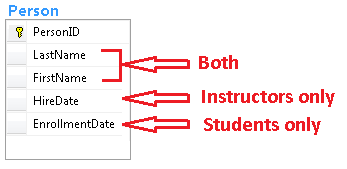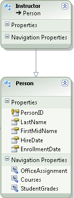 Instructor派生自Person的 和Student实体类型。 - 将与派生实体相关的属性从