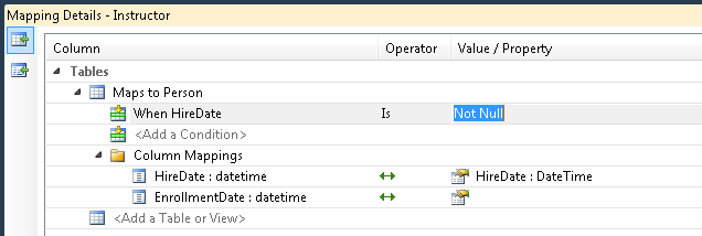 对Students实体重复该过程,指定在列不为 null 时EnrollmentDate此实体映射到Person表。 然后保存并关闭数据模型。