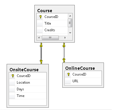 对于课程, School 数据库使用不同的模式。 在线课程和现场课程存储在单独的表中,每个表都有指向该表的 Course 外键。 这两种课程类型通用的信息仅 Course 存储在表中。