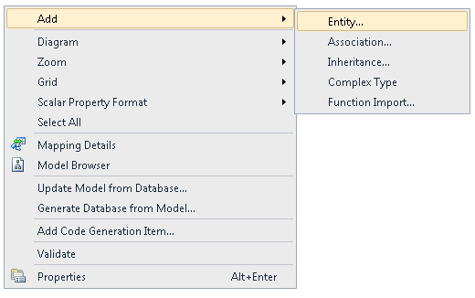打开 SchoolModel.edmx 文件,右键单击设计器中的未占用区域,选择“ 添加”,然后选择“ 实体”。