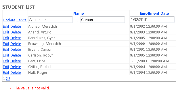 若要查看其工作原理,你将更改用于在现有 Students.aspx 页中显示和编辑字段的 Student 控件,并将格式设置和验证元数据添加到实体类型的名称和日期字段。
