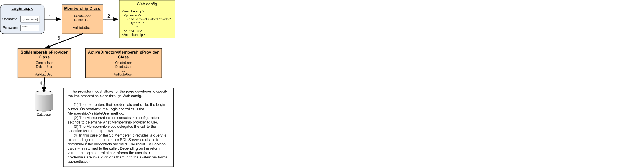成员资格框架使用 提供程序模型,该模型将成员资格框架的 API 与其实现完全分离。 这使开发人员能够使用通用 API,但使他们能够使用满足其应用程序的自定义需求的实现。 简言之,Membership 类定义了框架(方法、属性和事件)的基本功能,但实际上不提供任何实现详细信息。 相反,Membership 类的方法会调用配置的提供程序,这是执行实际工作的提供程序。 例如,调用 Membership 类的 CreateUser 方法时,Membership 类不知道用户存储的详细信息。 它不知道用户是否在数据库或 XML 文件或其他存储中维护。 Membership 类检查 Web 应用程序的配置,以确定要委托调用的提供程序,该提供程序类负责在适当的用户存储中实际创建新用户帐户。 图 3 说明了此交互。