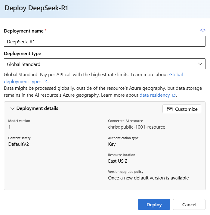 model参数中。 此设置允许在附加特定配置时为模型配置特定名称。Azure AI Foundry 会自动选择之前使用项目创建的 Foundry 资源。 使用“自定义”选项根据需求更改连接。 DeepSeek-R1 目前以 全局标准 部署类型提供,可提供更高的吞吐量和性能。