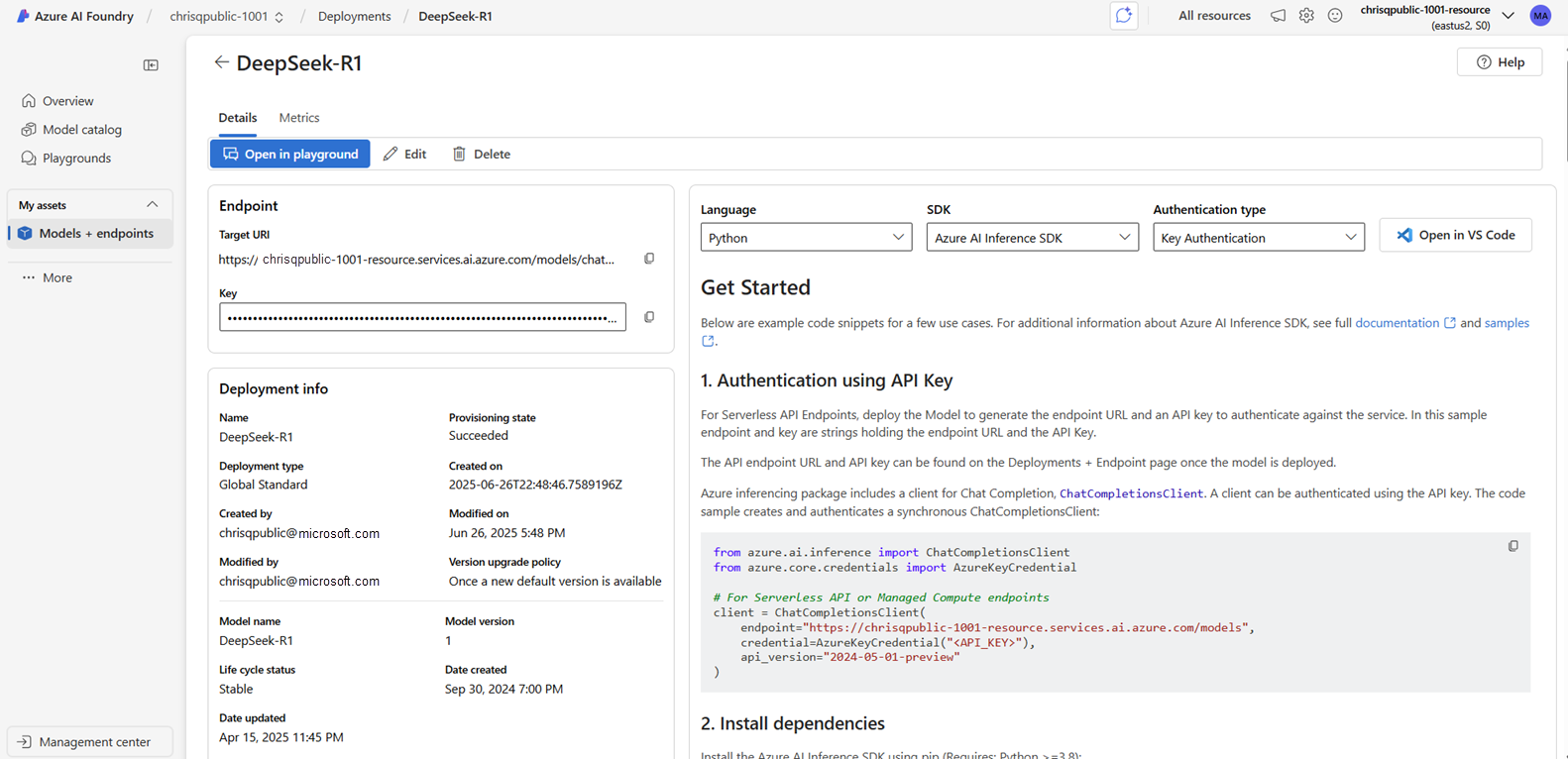部署完成后,“部署 详细信息 ”页随即打开。 现在,新模型已准备就绪,可供使用。