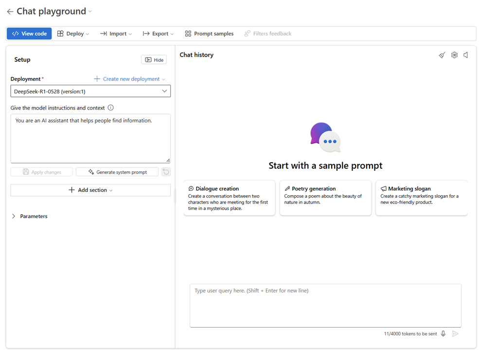 在部署详细信息页上,选择顶部栏中的“在操场中打开”。 此操作会打开聊天游乐场。