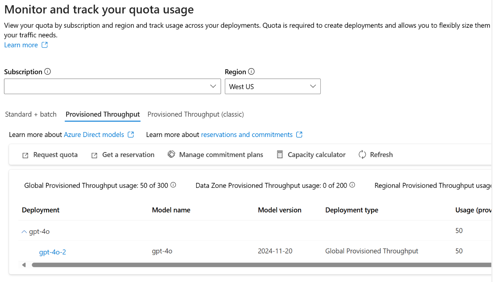 预配部署的配额在 Azure AI Foundry 中显示为以下部署类型: 全局预配、 数据区域预配 和 区域预配。