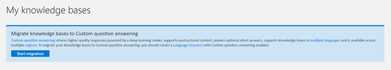 访问 https://www.qnamaker.ai,然后选择知识库页面上的迁移说明中的“开始迁移”。 这时将打开一个对话框以启动迁移。