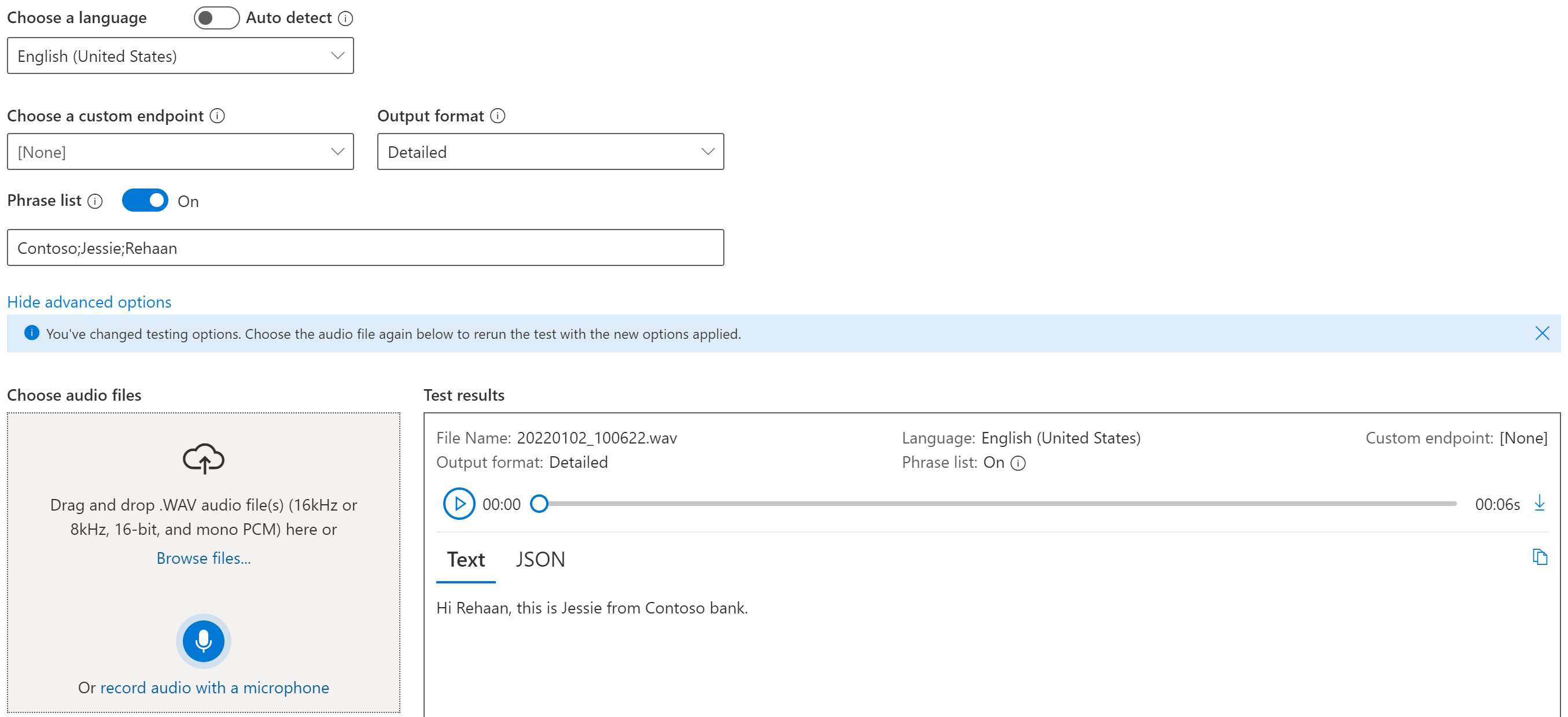 - 你应在“测试结果”文本框中看到“转录结果”。 如果未正确识别“Rehaan”、“Jessie”或“Contoso”,可以在下一步中将这些词添加到短语列表。
