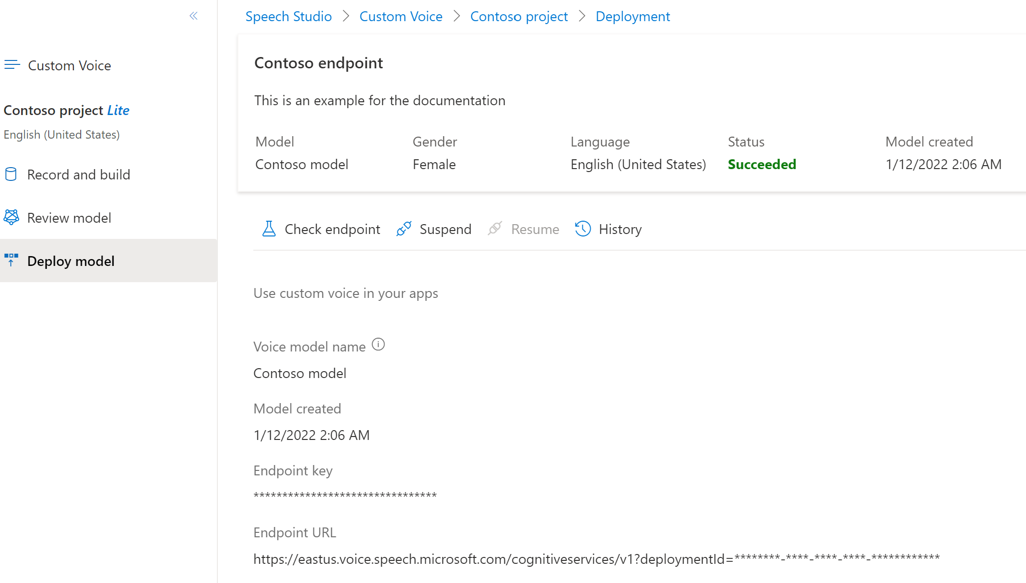 - “终结点密钥”显示终结点关联的语音资源密钥。 使用终结点密钥作为