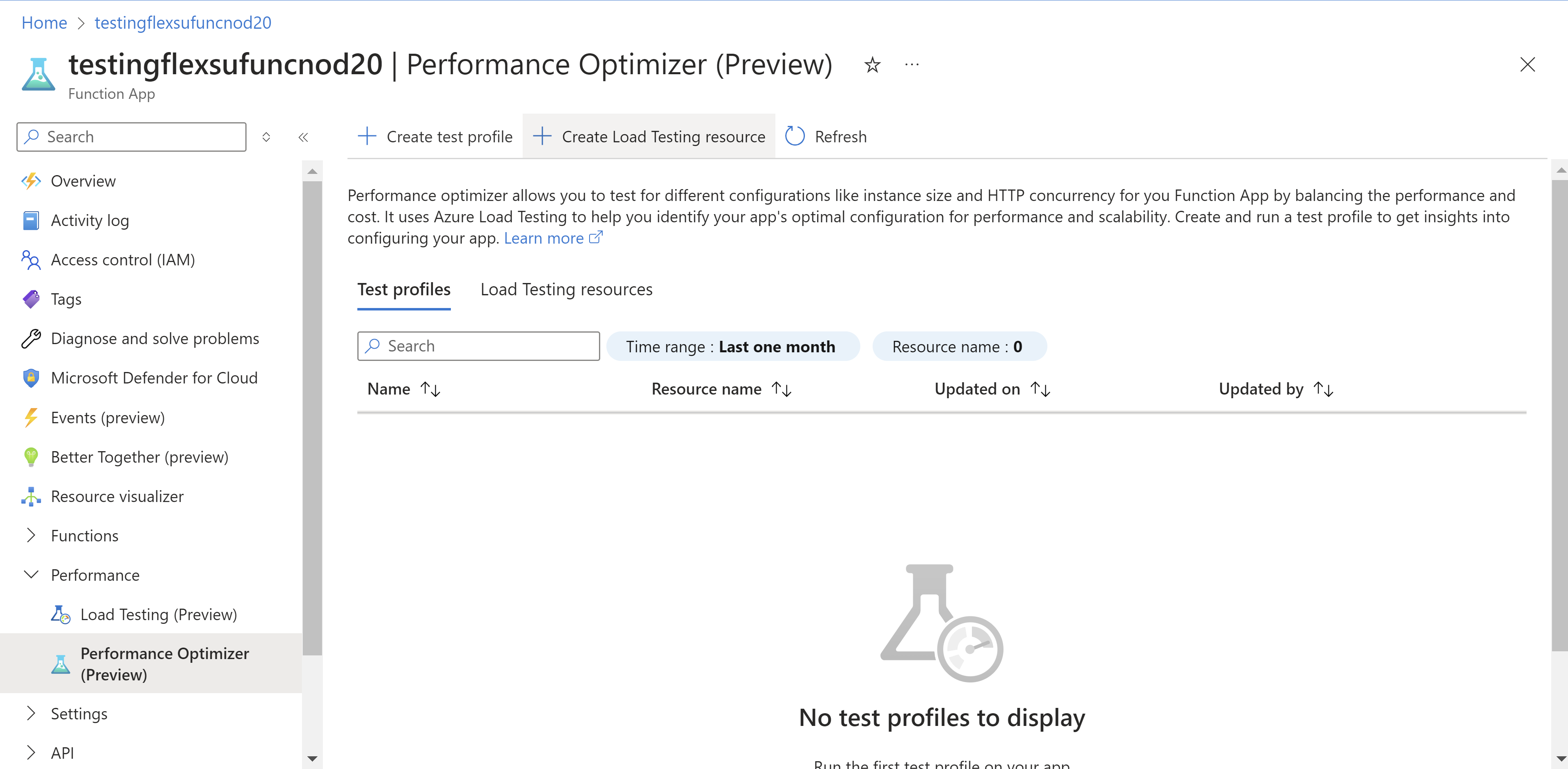 通过性能优化器,可以测试不同的配置,以帮助你找到性能与成本的正确平衡。 例如,可以测试 Functions 应用的实例大小和 HTTP 并发量等指标。 性能优化器使用 Azure 负载测试来帮助确定应用的最佳配置,以实现性能和可伸缩性。 可以使用 HTTP 触发器对函数运行性能优化器。 将代码部署到 Azure Functions 后,使用以下步骤运行优化器。