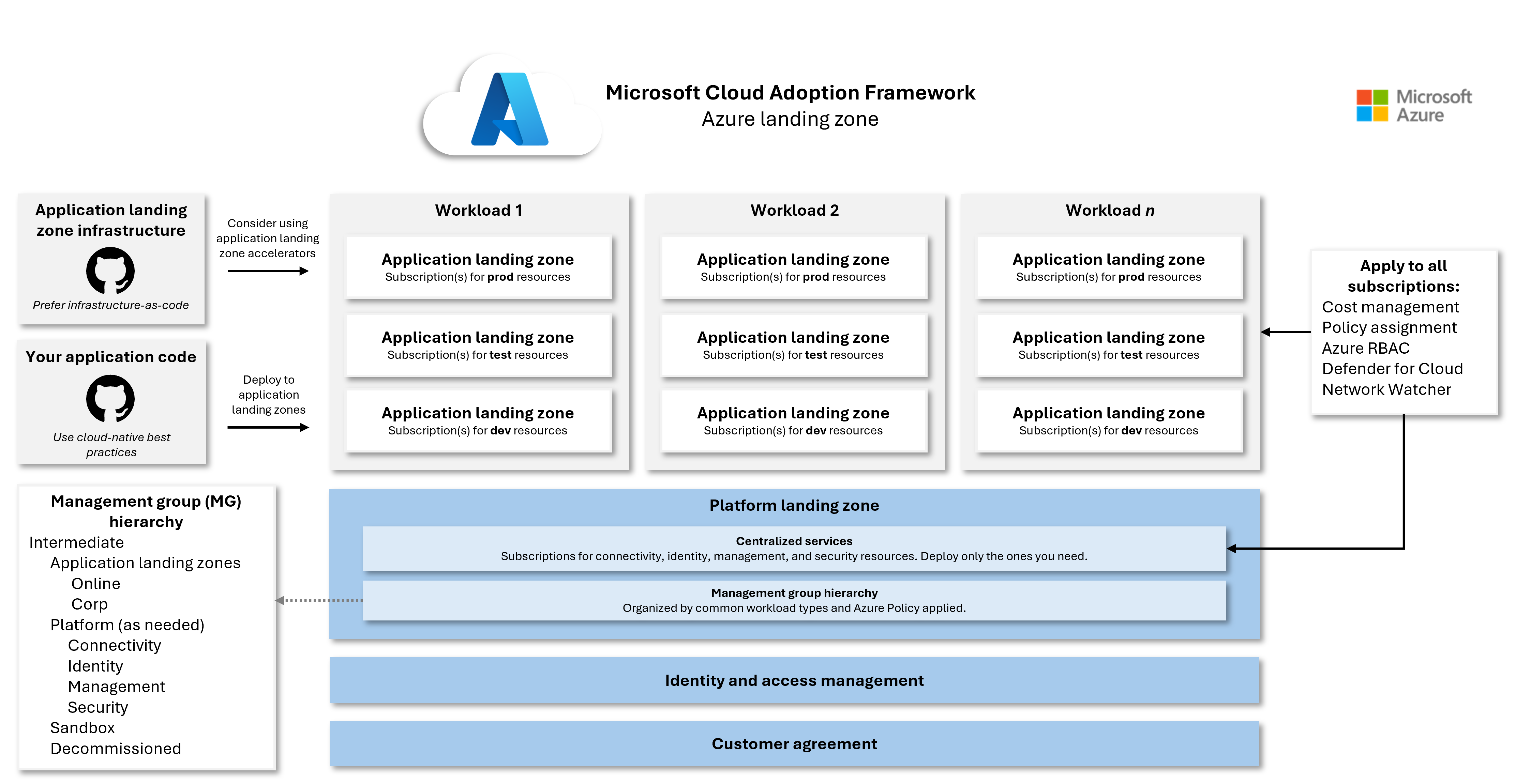 订阅是属于平台还是应用程序登陆区域,都应普遍启用某些配置。 这些配置包括:Azure Role-Based 访问控制(RBAC)、成本管理、网络观察程序以及 Microsoft Defender for Cloud。 这些服务有助于在整个 Azure 环境中保持可见性、安全性和作控制。