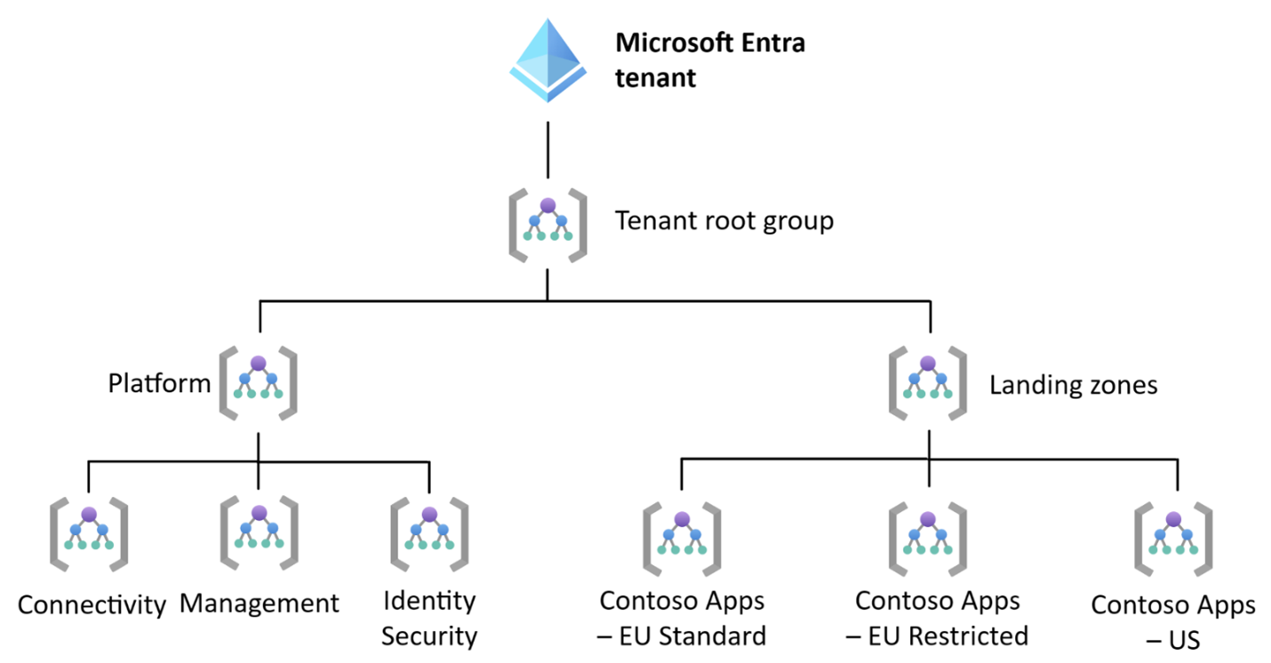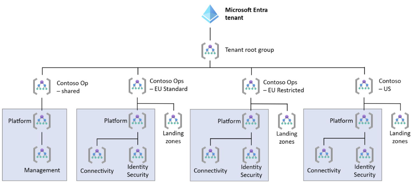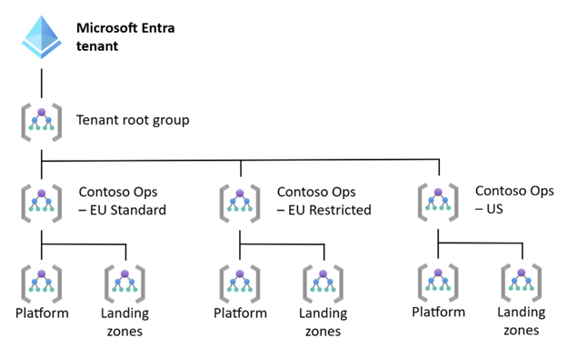 如果不需要单独的 Microsoft Entra 租户以提供严格的隔离,则应在单个 Microsoft Entra 租户中部署多个 Azure 登陆区域。 可以调整管理组层次结构,以满足冲突法规的要求。