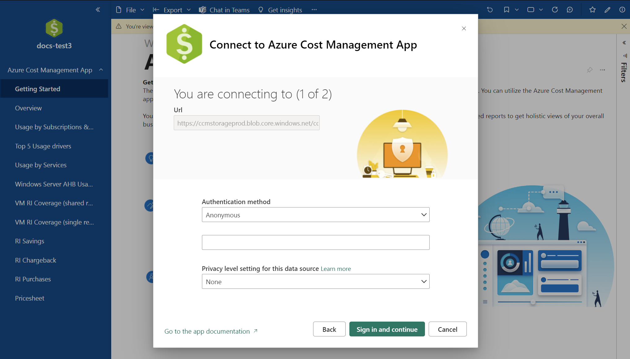 - 在下一页上,设置 OAuth2 作为“身份验证方法”,设置“无”作为“隐私级别”。 然后登录,以便对注册进行身份验证。 此步骤还启动 Power BI 数据刷新。