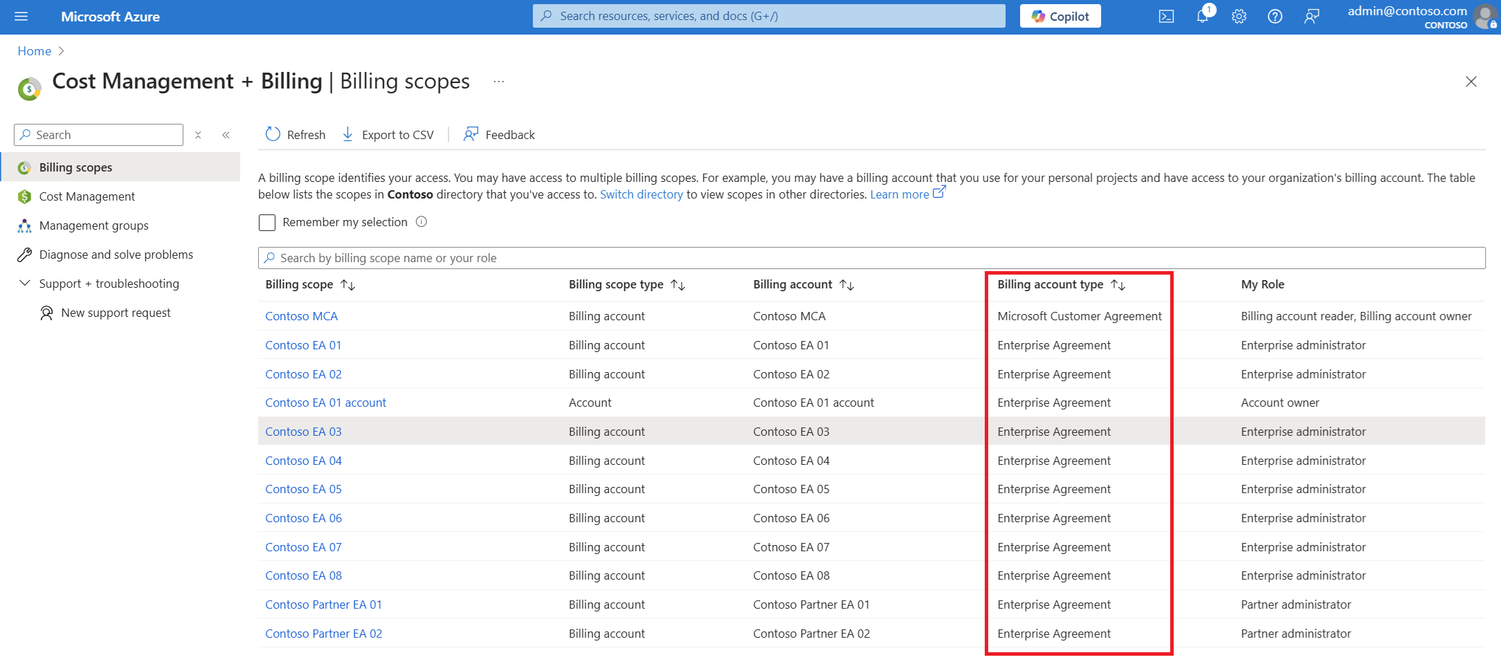 如果你有权访问多个计费范围,请从左侧菜单中选择“计费范围”,然后在“计费帐户类型”列中检查类型。