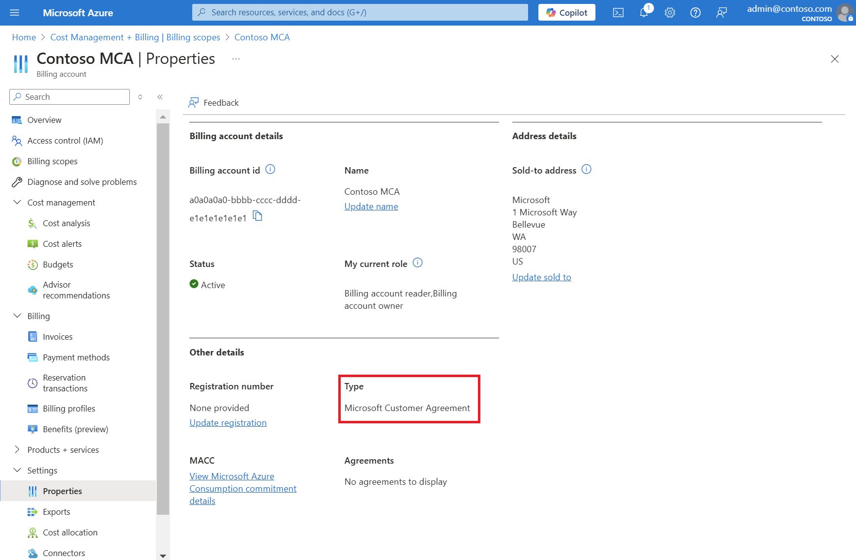 “属性”窗格上的“类型”值确定帐户类型。 它可以是 Microsoft 在线订阅计划、企业协议、Microsoft 客户协议或 Microsoft 合作伙伴协议。 若要详细了解计费帐户类型,请参阅在 Azure 门户中查看计费帐户。