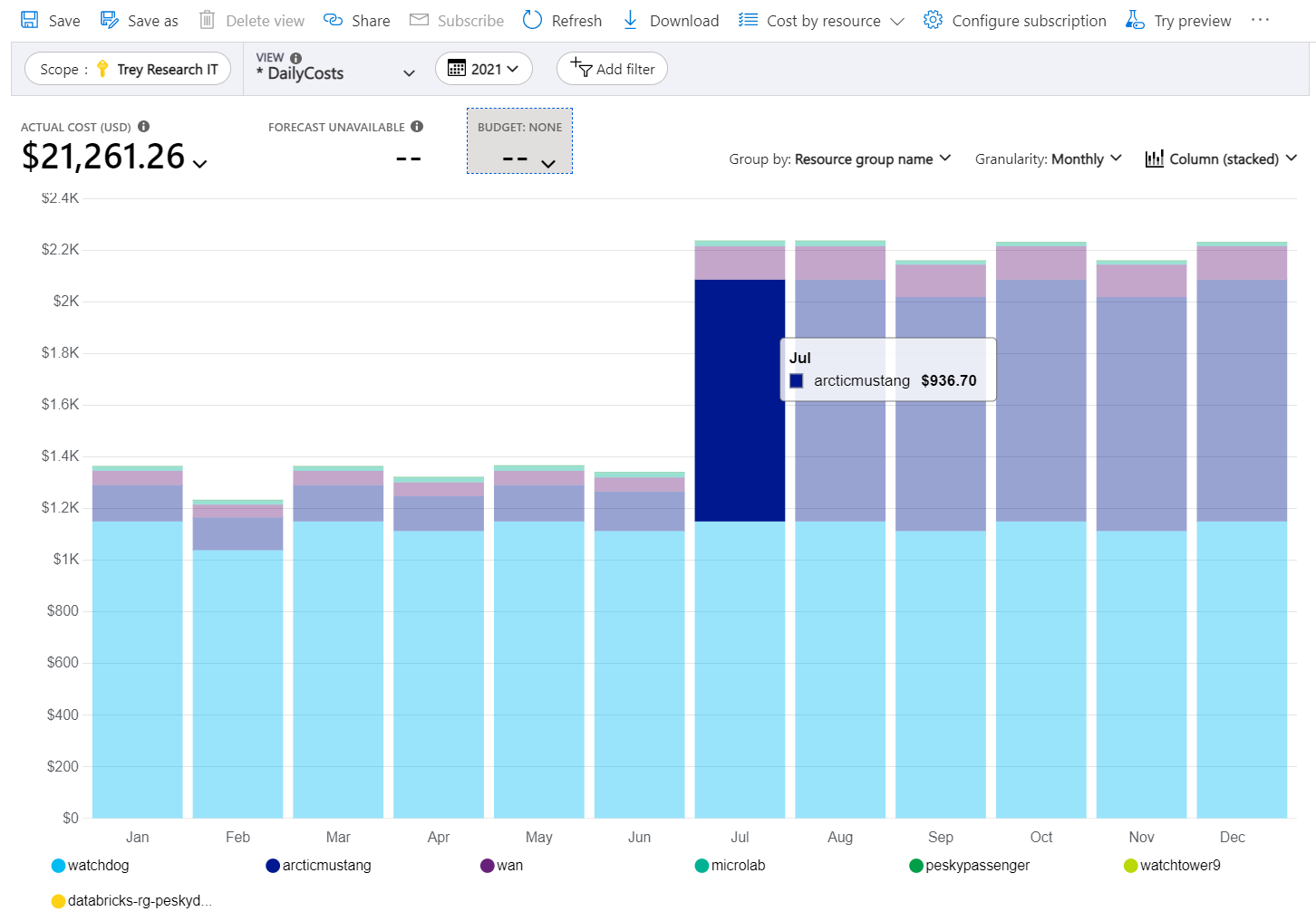 将视图更改为 “每日成本 ”,然后将日期范围扩展到“去年”。 然后,将粒度设置为“每月”。 在下图中可以看到,从 7 月开始,arcticmustang 资源组的成本显著增加。