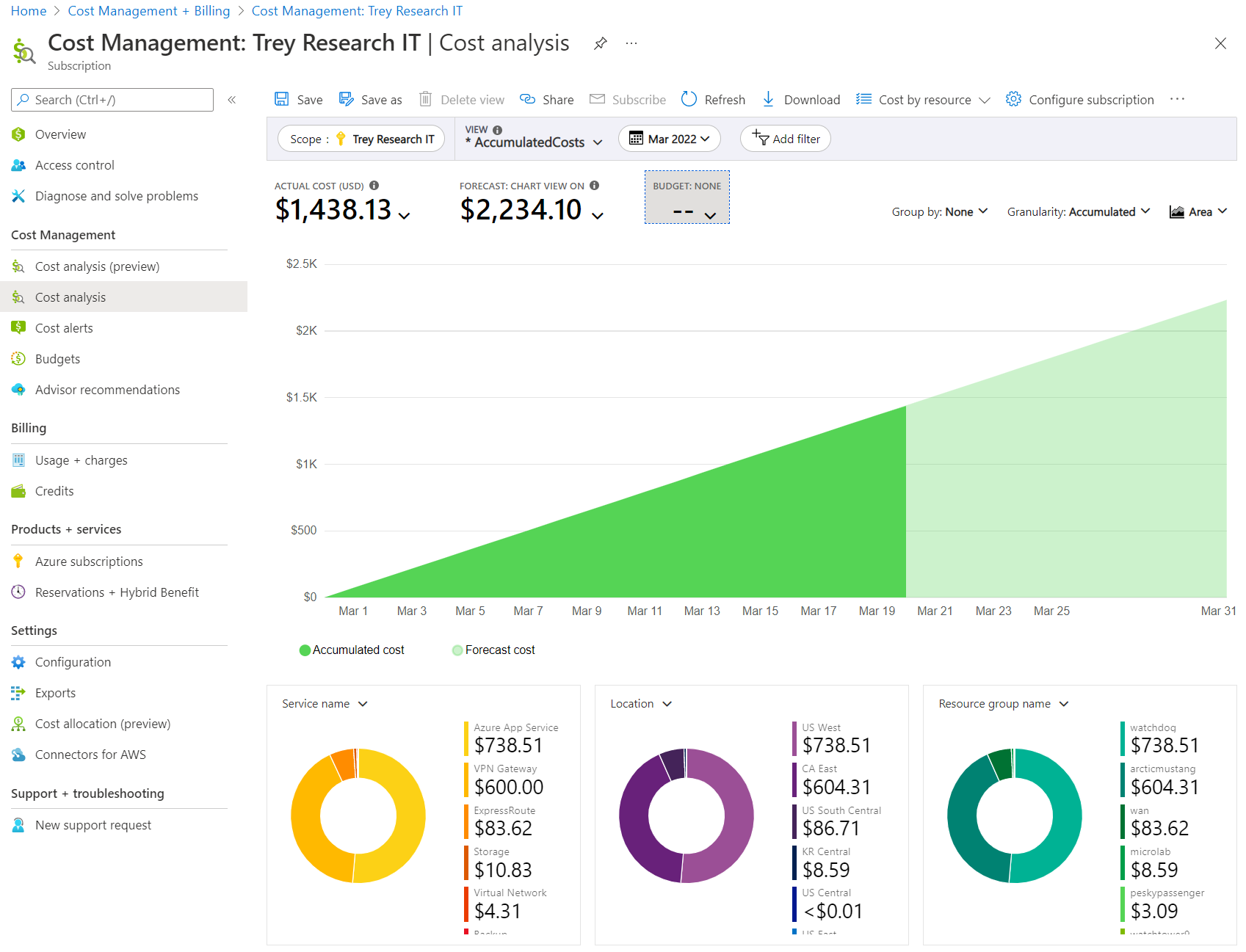 让我们查看一个有关查找成本变化的更详细示例。 导航到“成本分析”并选择订阅范围时,从 “累计成本 ”视图开始。 以下屏幕截图显示了你可能会看到的内容示例。