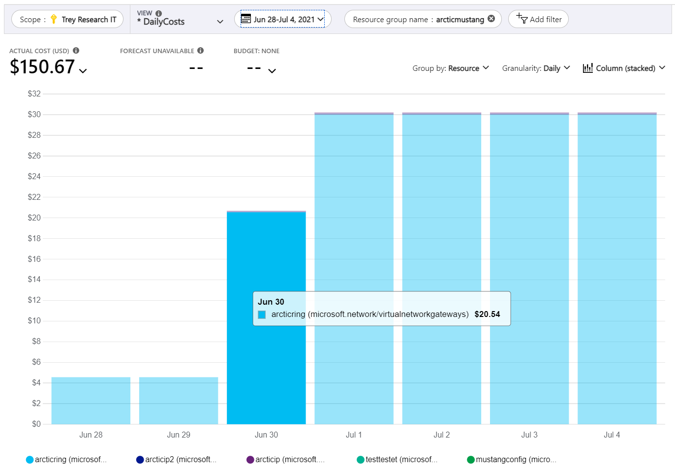 让我们继续深入查看数据以详细了解成本增加的问题。 选择成本增加的项 (articmustang) 以自动设置资源组名称的筛选器。 然后,将“分组依据”列表更改为“资源”。 然后将日期范围设置为较短的时间段。 例如,6 月 28 日至 7 月 4 日。 以下示例插图清楚地显示了成本的增加。 资源类型显示为“microsoft.network/virtualnetworkgateways”。