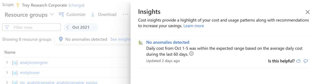 选择订阅范围时,成本分析智能视图中提供了异常情况检测。 可以在 Insights 中查看异常状态。