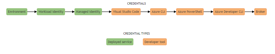 DefaultAzureCredential 是一个固定的预配置凭据链。 它旨在支持许多环境,以及最常见的身份验证流和开发人员工具。 在图形形式中,基础链如下所示: