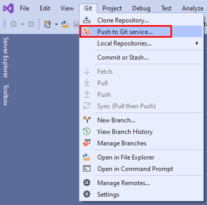 在“解决方案资源管理器”中,右键单击解决方案名称,或右键单击“解决方案资源管理器”的“文件夹”视图中的任何项,然后选择“推送到 Git 服务”以启动“创建 Git 存储库”窗口。