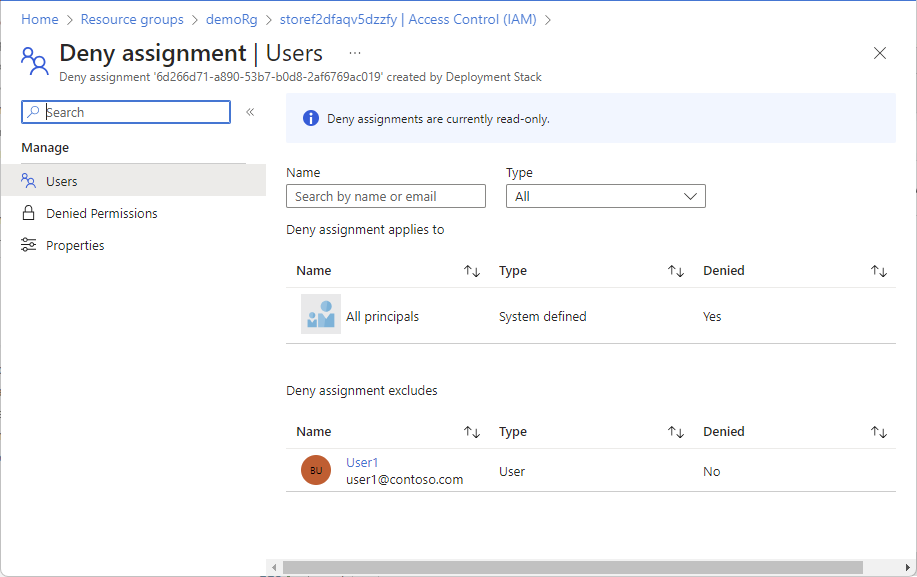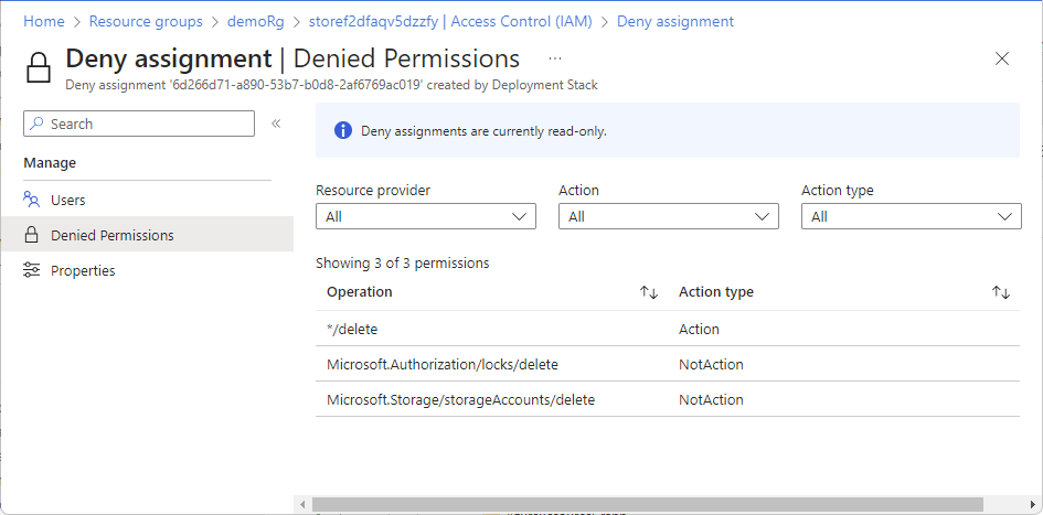 DenyAssignmentName : Deny assignment '6d266d71-a890-53b7-b0d8-2af6769ac019' created by Deployment Stack '/subscriptions/11111111-1111-1111-1111-111111111111/resourceGroups/demoRg/providers/Microsoft.Resources/deploymentStacks/demoStack'.