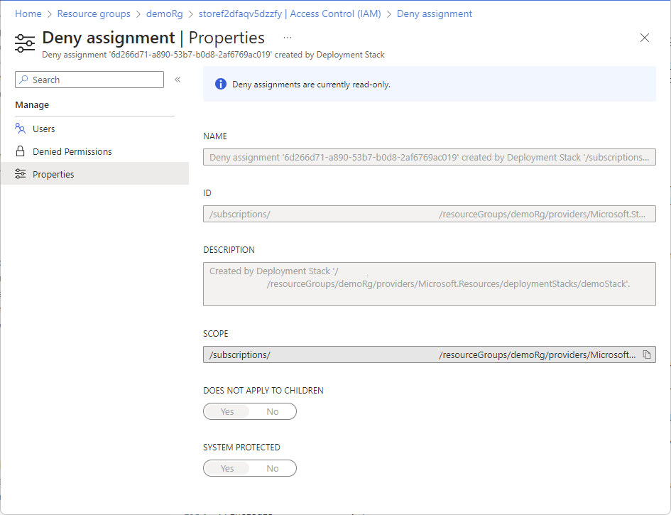 DenyAssignmentName : Deny assignment '36a162b5-ddcc-529a-9deb-673250f90ba7' created by Deployment Stack '/subscriptions/11111111-1111-1111-1111-111111111111/resourceGroups/demoRg/providers/Microsoft.Resources/deploymentStacks/demoStack'.