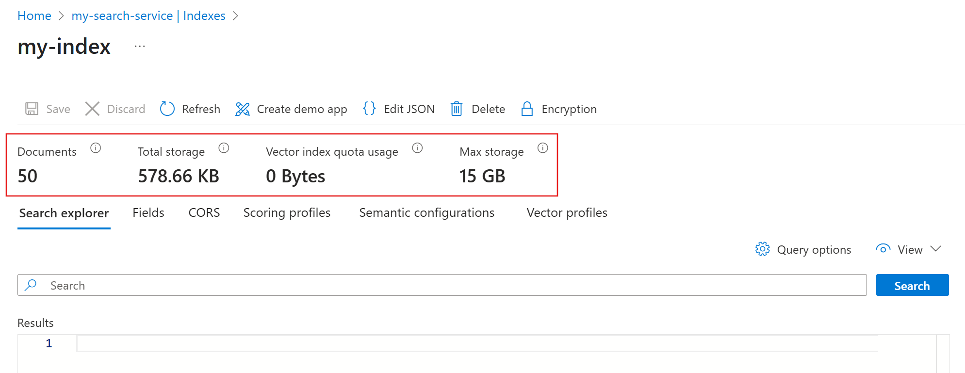 使用首选的 Azure SDK 检索索引的文档计数、存储使用情况和矢量存储使用情况。