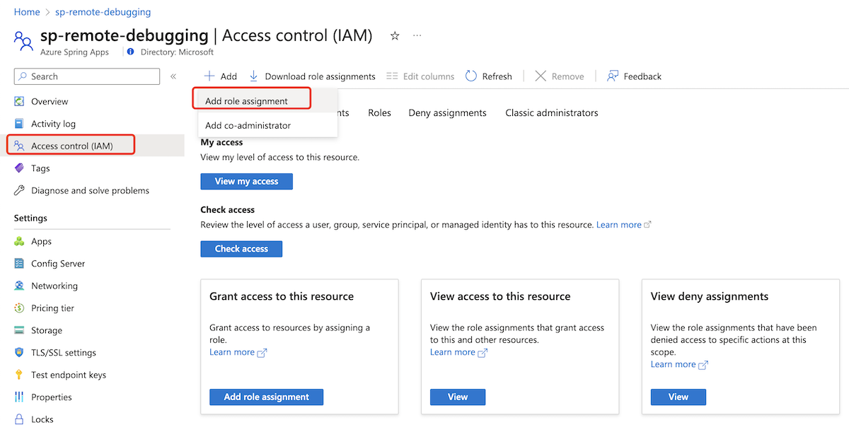 Azure 门户中 Azure Spring Apps 实例的“访问控制(IAM)”页的屏幕截图,其中突出显示了“添加角色分配”选项。