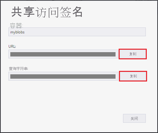 然后会显示第二个“共享访问签名”对话框,其中列出了可用来访问存储资源的 blob 容器以及 URL 和 QueryString。 选择要复制到剪贴板的 URL 旁边的“复制”。