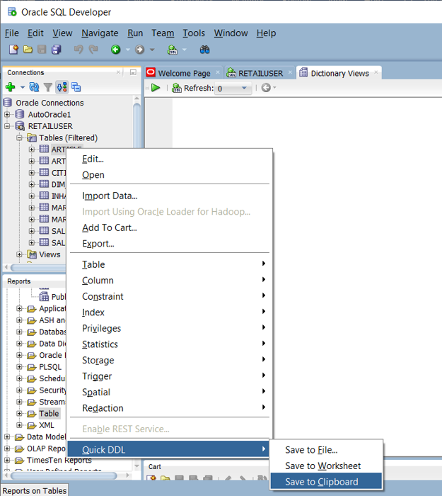 在 Oracle 环境中,系统目录表指定当前表/视图定义。 与用户维护的文档不同,系统目录信息始终是完整的并与当前表定义同步。 可以使用 Oracle SQL Developer 等实用工具访问系统目录信息。 Oracle SQL Developer 可生成 CREATE TABLE DDL 语句,你可编辑这些语句,以应用于 Azure Synapse 中的等效表,如以下屏幕截图所示。