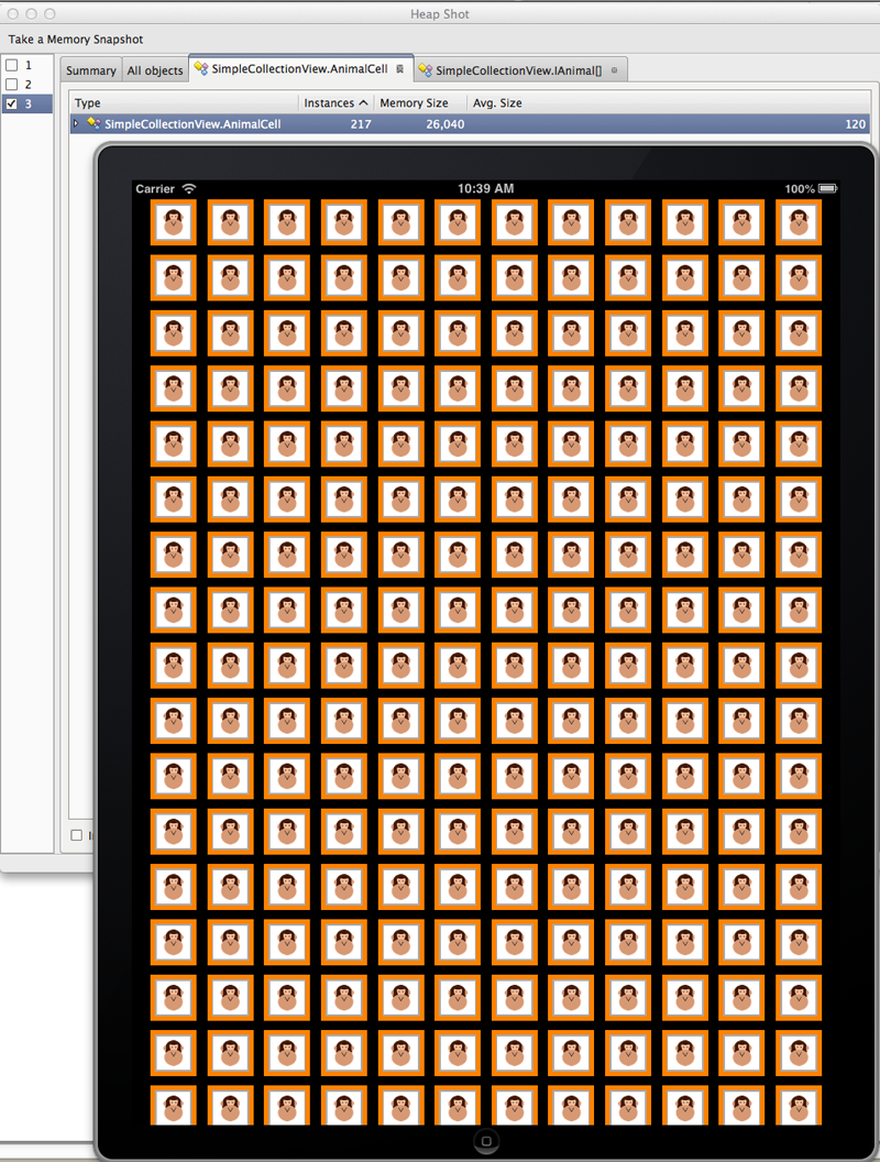The UICollectionView is designed to work with large datasets. The two major attributes of this design are the "reuse queue" for component views and the UICollectionViewDataSource interface. The reuse queue is a system-managed collection of component views that minimizes memory consumption by only allocating those views that are on-screen and a handful of "next visible" screens. The following illustration, based on a variation of the code from the "Introduction to Collection Views" sample, shows how efficient this reuse queue is: 204 views are visible but the reuse queue only consists of 217 instances of the AnimalCell subtype of UICollectionViewCell. The dataset numbers in the thousands, but the number of actually allocated view components is minimal.