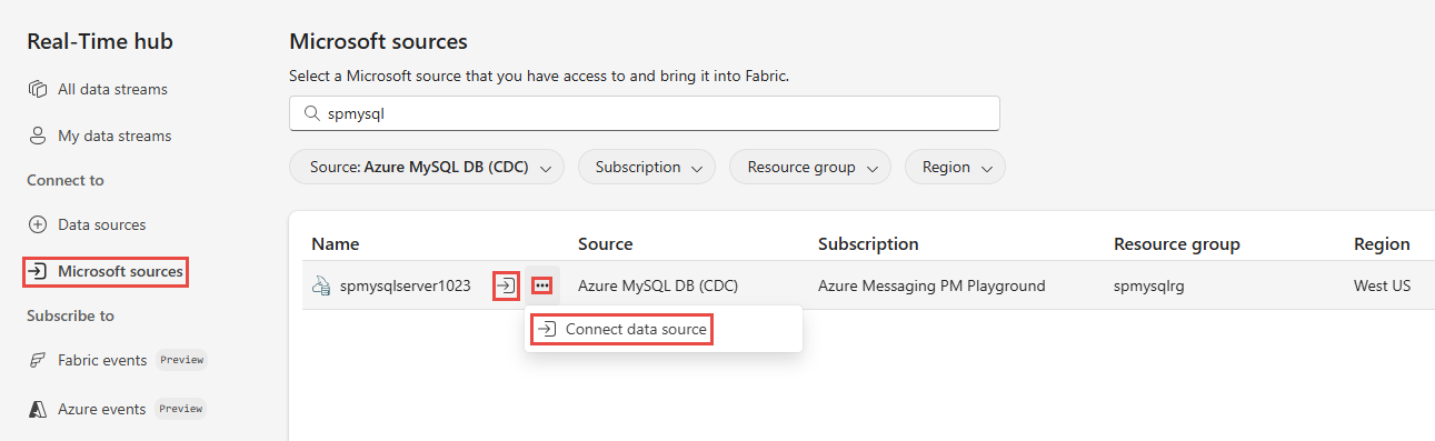 现在,将鼠标移在要连接到数据库列表中的实时中心的 Azure MySQL DB CDC 源的名称上,并选择“连接”按钮,或选择 "..."(省略号),然后选择“连接”按钮。