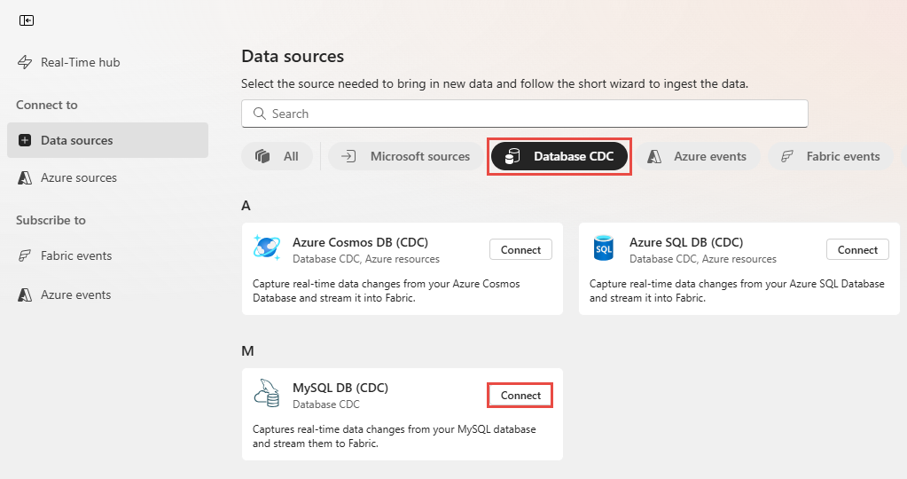 可以通过以下方法之一将事件从 Azure MySQL Database CDC 获取到实时中心: