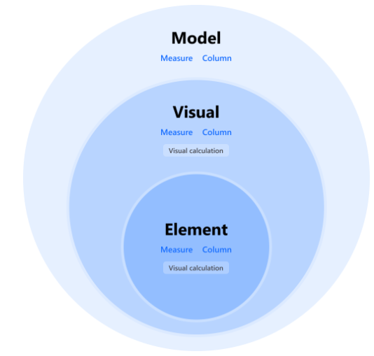 由于视觉计算不在模型中,因此它们不能在模型级别设置格式字符串,但可以在视觉对象或元素级别设置。 度量值和列可以在所有三个级别上具有格式字符串: