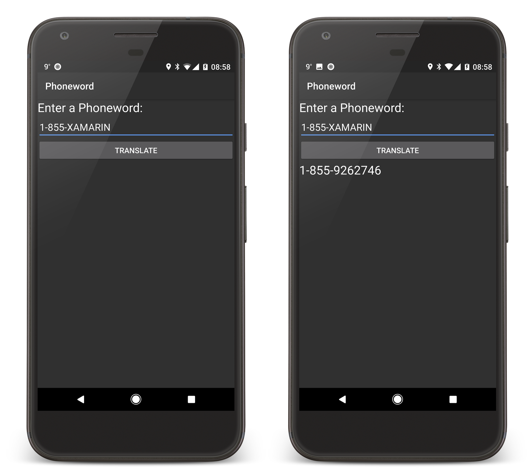 最后,通过在 Android 设备或仿真器上运行应用程序并转换 Phoneword 以测试此应用程序: