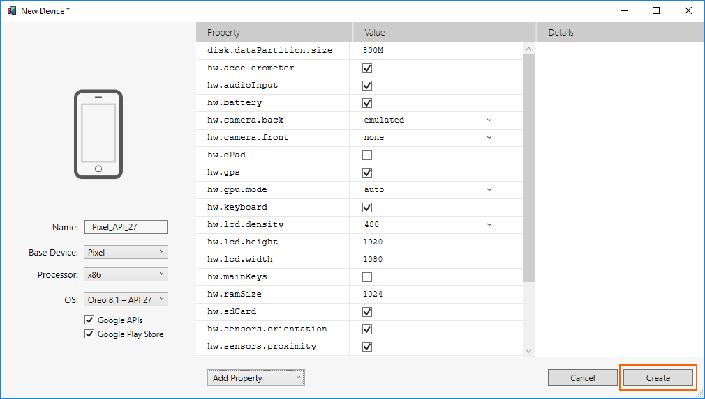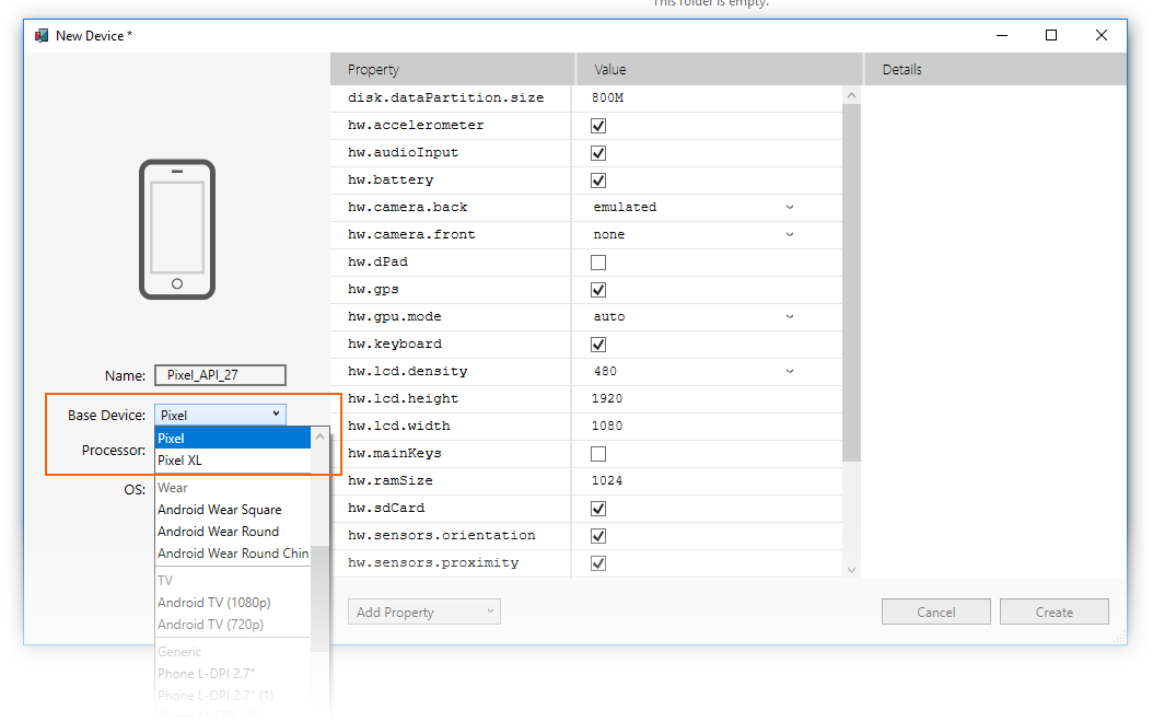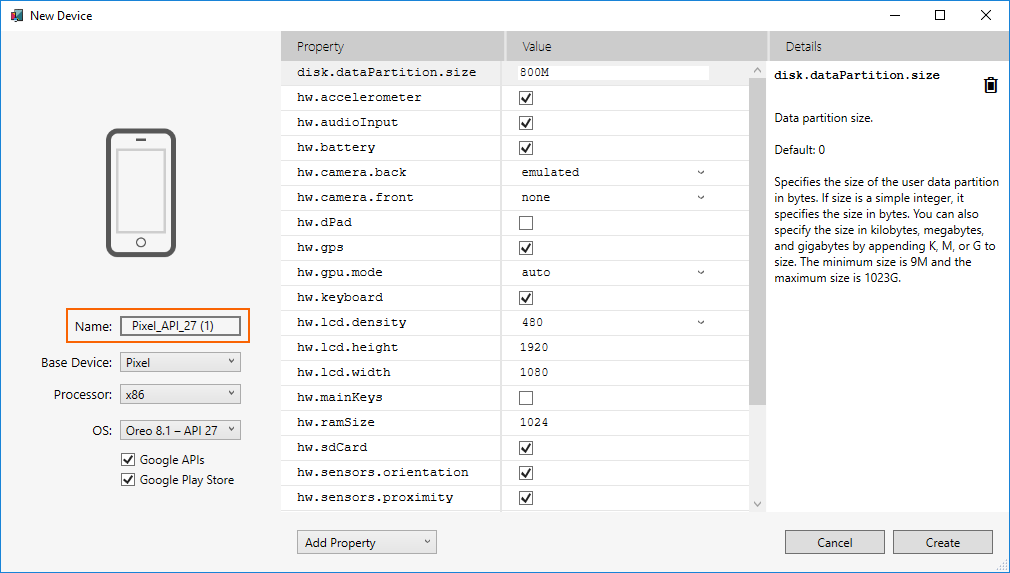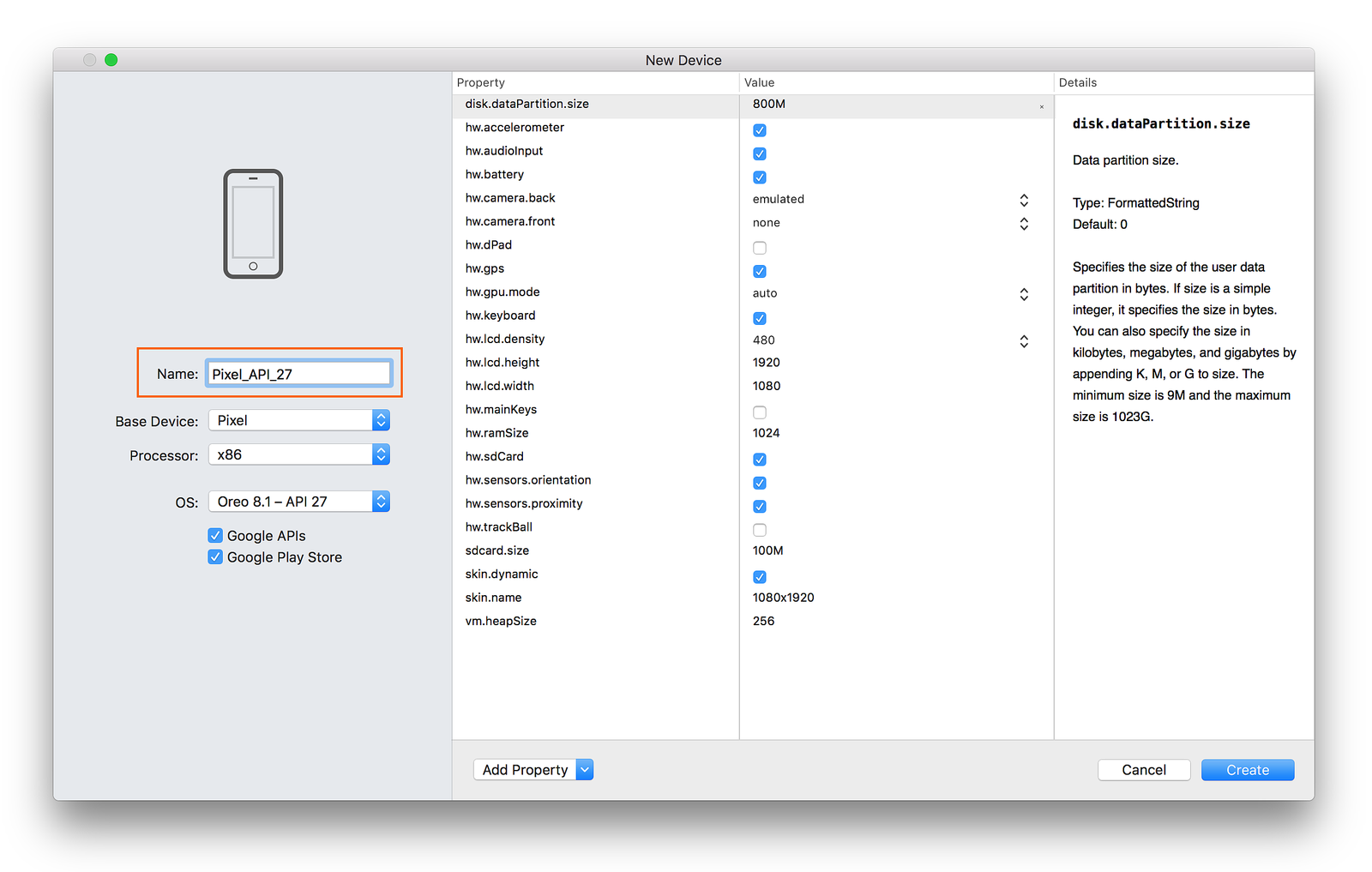 为设备提供新名称。 在下面的示例中,新设备名为“Pixel_API_27”: