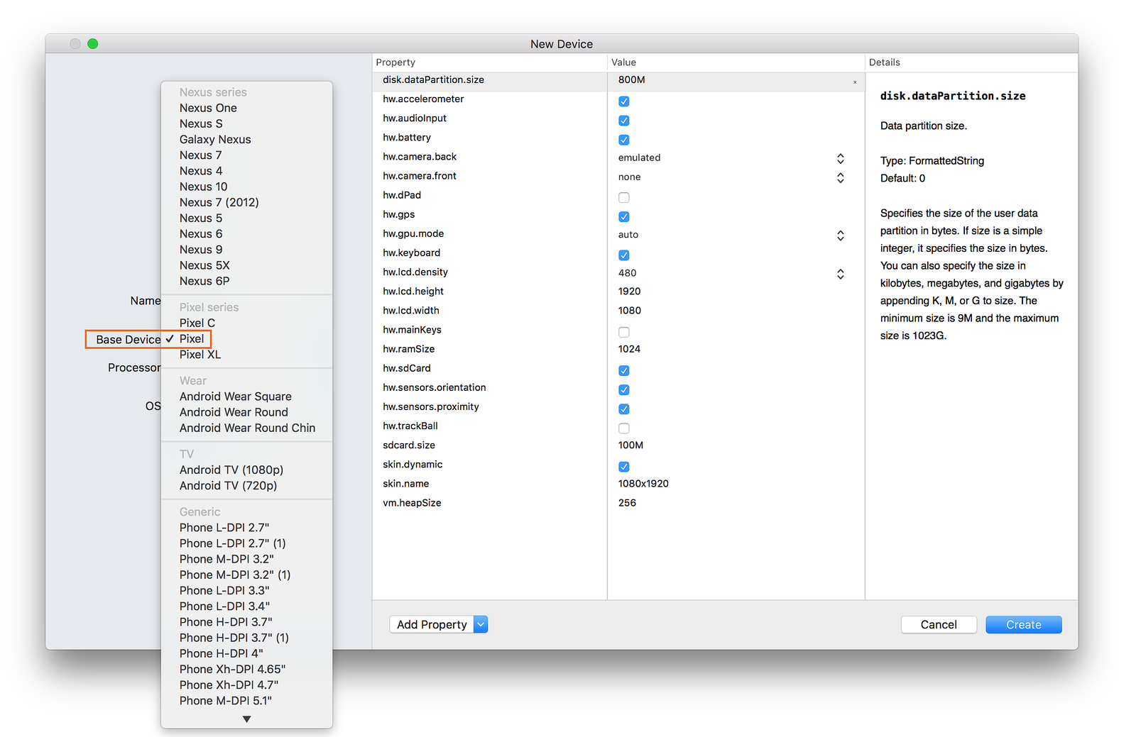 编辑需要修改的任何属性。 若要对属性进行更改,请参阅编辑 Android 虚拟设备属性。