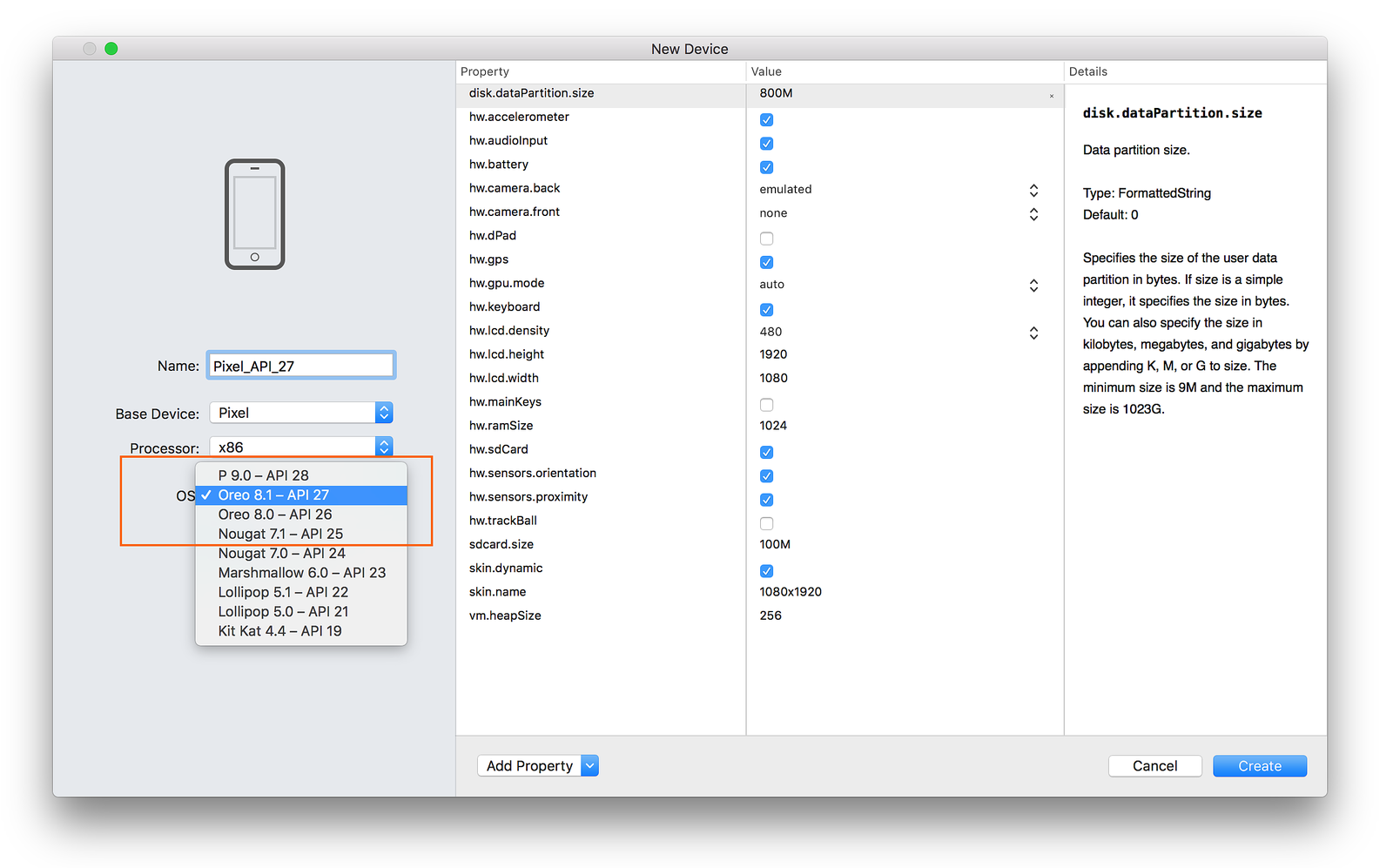 单击“OS”下拉菜单可选择 Android 版本(API 级别)。 例如,选择“Oreo 8.1 - API 27”以创建 API 级别为 27 的虚拟设备:
