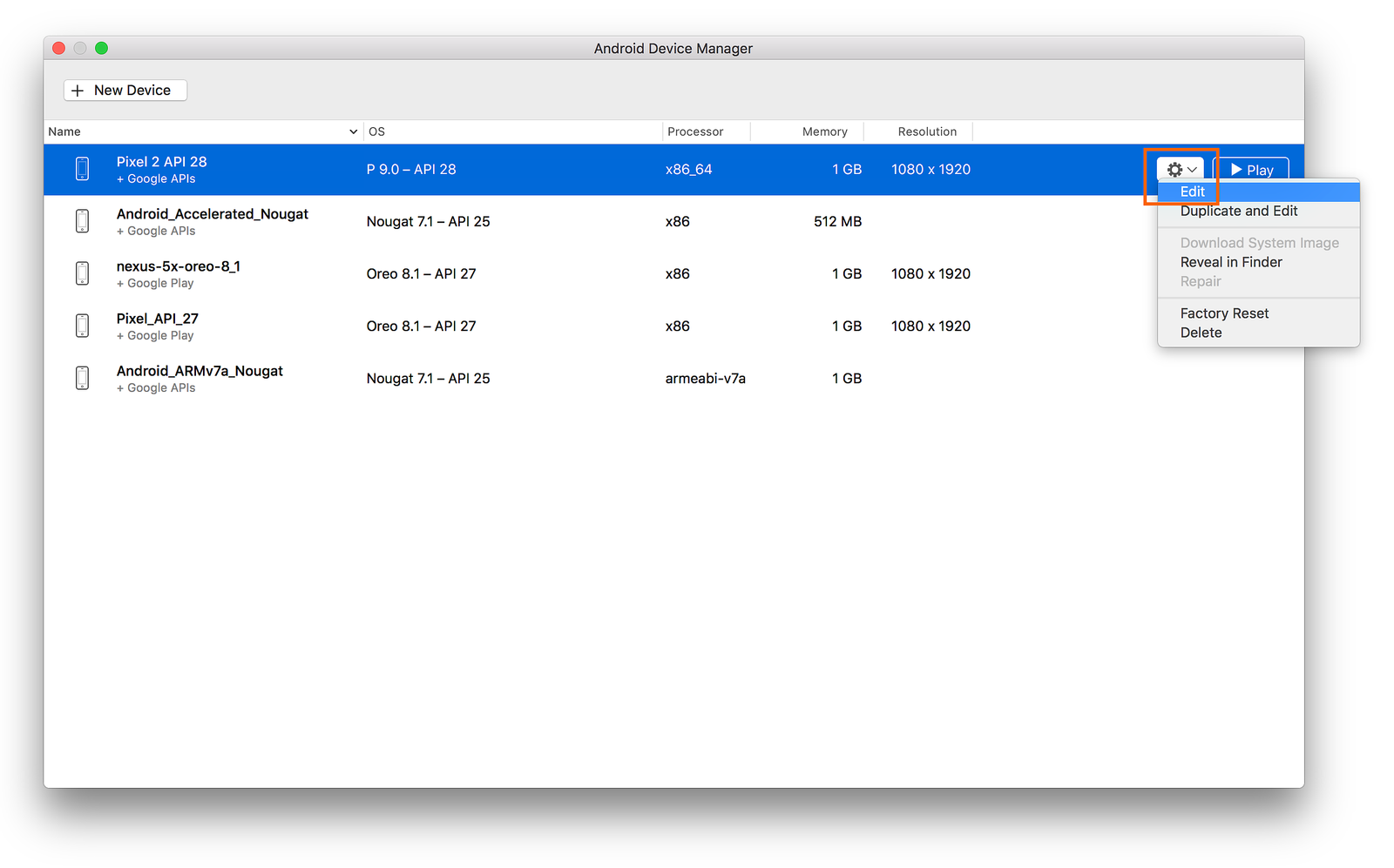 复制和编辑 – 复制当前所选的设备,并会在“新建设备”屏幕中使用不同的唯一名称将其打开。 例如,选择“Pixel 2 API 28”并单击“复制和编辑”可将计数器追加到名称中: